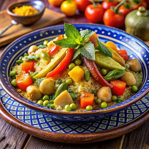 طبق تقليدي بالكسكس المصنوع من الشعير المغذي، مزين بالخضروات الموسمية المشوية كالكرعة والفلفل والباذنجان مع نكهة النعناع الطازج.